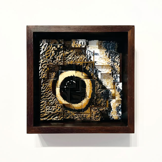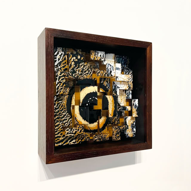 La fascination est à l’origine d’une observation minutieuse et détaillée des ailes de papillons et a inspiré l’idée d’en reproduire fidèlement les motifs et les couleurs en allant au-delà de l’apparence réelle. C’est par la matière et la création de reliefs que l’œuvre trouve sa forme finale et appelle à une nouvelle observation. Au regardeur en mouvement de trouver l’angle qui lui permettra de recomposer le dessin originel.