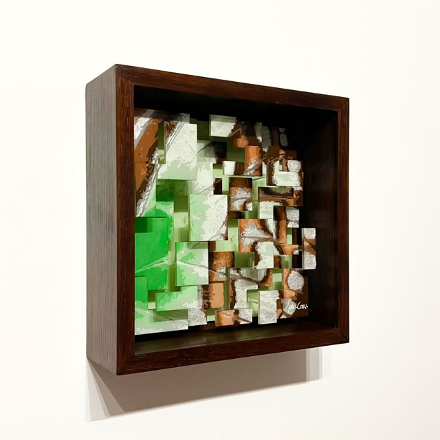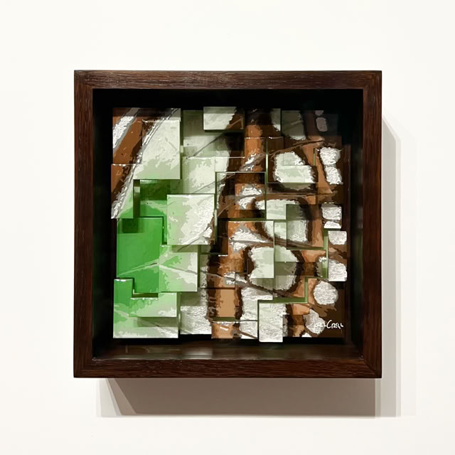 La fascination est à l’origine d’une observation minutieuse et détaillée des ailes de papillons et a inspiré l’idée d’en reproduire fidèlement les motifs et les couleurs en allant au-delà de l’apparence réelle. C’est par la matière et la création de reliefs que l’œuvre trouve sa forme finale et appelle à une nouvelle observation. Au regardeur en mouvement de trouver l’angle qui lui permettra de recomposer le dessin originel.