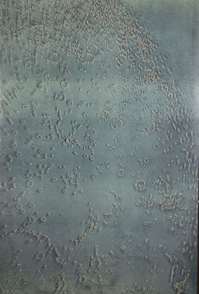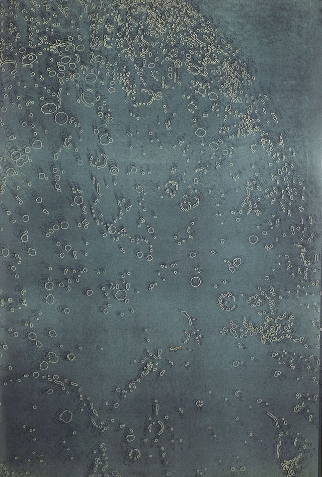 Que reste-t-il de notre Lune quand l’espace de fond et l’espace de forme se confondent ? Des IMPACTS qui témoignent de l’existence passée d’une matière évaporée et dessinent une forme disparue. Seule l’empreinte des cratères subsiste mais déjà se brouille, sur le point de disparaître aussi.