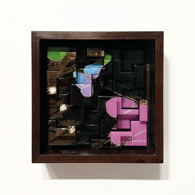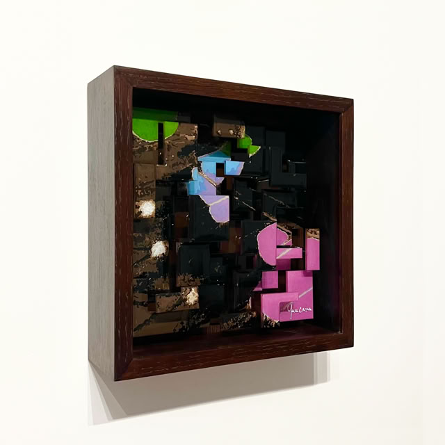 La fascination est à l’origine d’une observation minutieuse et détaillée des ailes de papillons et a inspiré l’idée d’en reproduire fidèlement les motifs et les couleurs en allant au-delà de l’apparence réelle. C’est par la matière et la création de reliefs que l’œuvre trouve sa forme finale et appelle à une nouvelle observation. Au regardeur en mouvement de trouver l’angle qui lui permettra de recomposer le dessin originel.