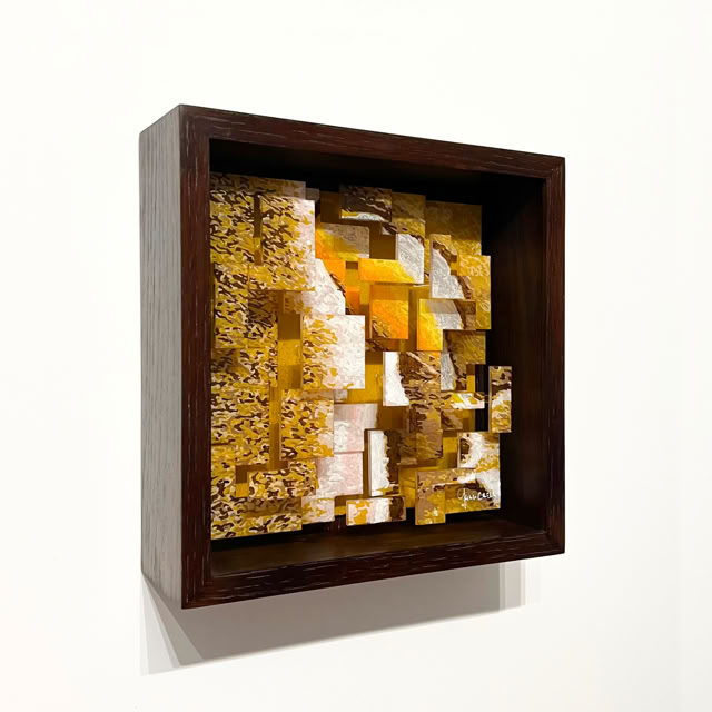 La fascination est à l’origine d’une observation minutieuse et détaillée des ailes de papillons et a inspiré l’idée d’en reproduire fidèlement les motifs et les couleurs en allant au-delà de l’apparence réelle. C’est par la matière et la création de reliefs que l’œuvre trouve sa forme finale et appelle à une nouvelle observation. Au regardeur en mouvement de trouver l’angle qui lui permettra de recomposer le dessin originel.